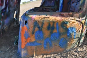 The first planned stop of the day made me do it. Yep, I took an interstate. This was the only way, well probably not, that I could get to the Cadillac Ranch. The Ranch is an area landmark located just west of Amarillo, where someone stuck a fleet of Caddies, nose first, into the ground, in a middle of an open field. They all stand there, with their tails up in this air, angled East. This is a pilgrimage area of sorts. As I approched the spot, just before I turned left since it is on the south side of the interstate, I spotted the old sign that reads: Bates Motel, and has some words about taxidermy. I parked by the open gate that lets pretty much anybody wander in, and immediatelly saw the hundreds of spray paint cans that litter the site. People who visit here often do so with the idea of leaving their tag behind. I was their with a similar idea in mind, excpet for me, it was to leave one of the orange flags there too.It took some time to walk around and take photos, before finally selecting a spot, tying the orange flag of freedom the the rear axle of one of the old Cadillacs, watching it wave in the wind. I was then struck by the thought that maybe some of those cans may have paint in them, and sure enough, I soon found one with blue that was pretty full. Finding a spot on one of the cars the had almost nothing on it, I sprayed it with N4S. I almost immediatelly let go of the can, as if it had been some sort of weapon I had just used to commit a crime. I smiled. Yep, at 52 I had executed my first tag.