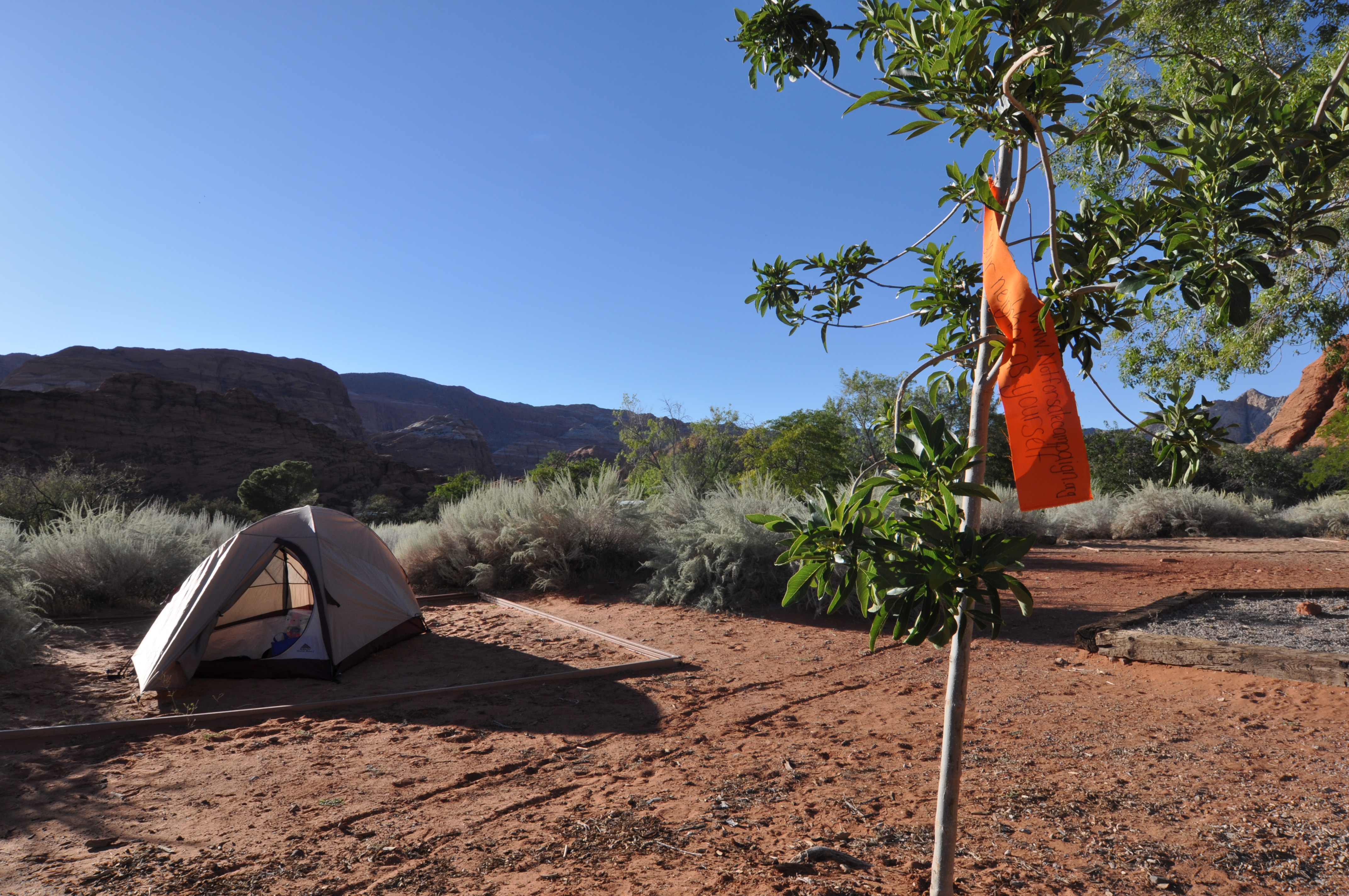 This US highway tracks the northern rim of the Grand Canyon, making it through the northern park entrance at Jackob Lake. I kept going, wishing for time to visit, as it happens with so many other palces in my journeys. I stopped at a scenic view site, and decided that it would be a great place to plant a flag. I kneeled and prayed for the slaves, and tied the orange fabric, with its biblical scripture, to one of the trees. There I also met a British man, who, along with his father, had rented a couple of Harleys for three weeks and were travelling through out the region. I also met a Swiss man, who had praises for old BMWs, and who was on his way to Vegas on a rented RV.
