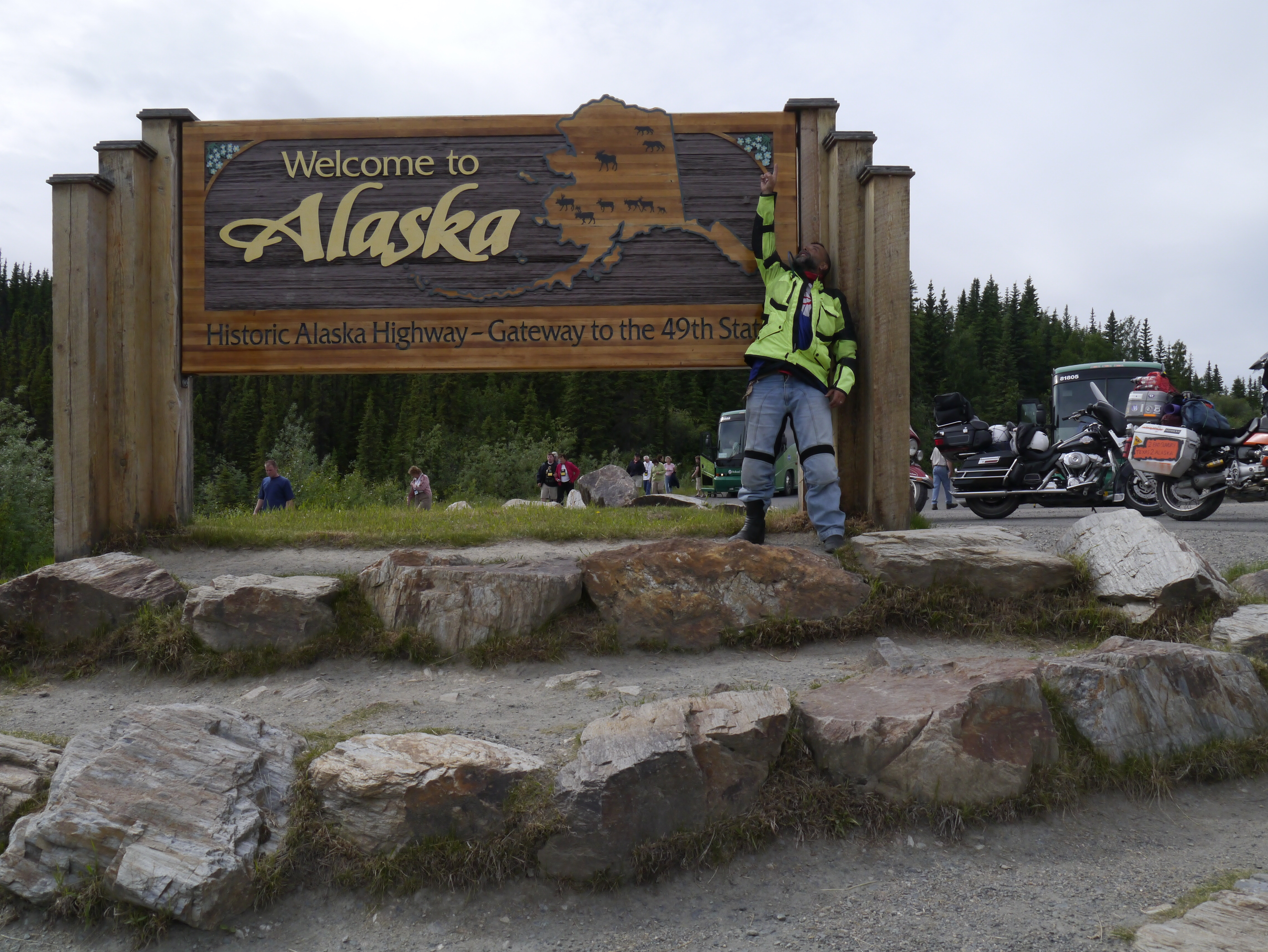 Finally, today I rode into Alaska. The day started just south of Whitehorse. Over night, a couple of showers came down, but in my tent I just heard the rain fall, in the middle of my midnight sun slumber. I packed up and set off. Whitehorse is a lot bigger and more developed than I thought. I stopped briefly to take a photo by a totem. Then, it was the Alcan again. I had begun to think that all the stories about the frost heaves and bowling ball deep potholes were mythologies of travelers that wanted to aggrandize their journey. Not so. The Alcan was saving the hardest for last. The road between Whitehorse and the US border was indeed a combination of heaves, that would often be preceded by potholes, or would hide them after the apex. To this, add several stretches of loose gravel, and mountain pass travel, and you get the perfect combination for slow travel. Yet, the Yukon remains an immensely majestic territory, with expansive forests of conifers, and poplars that take your breath away.