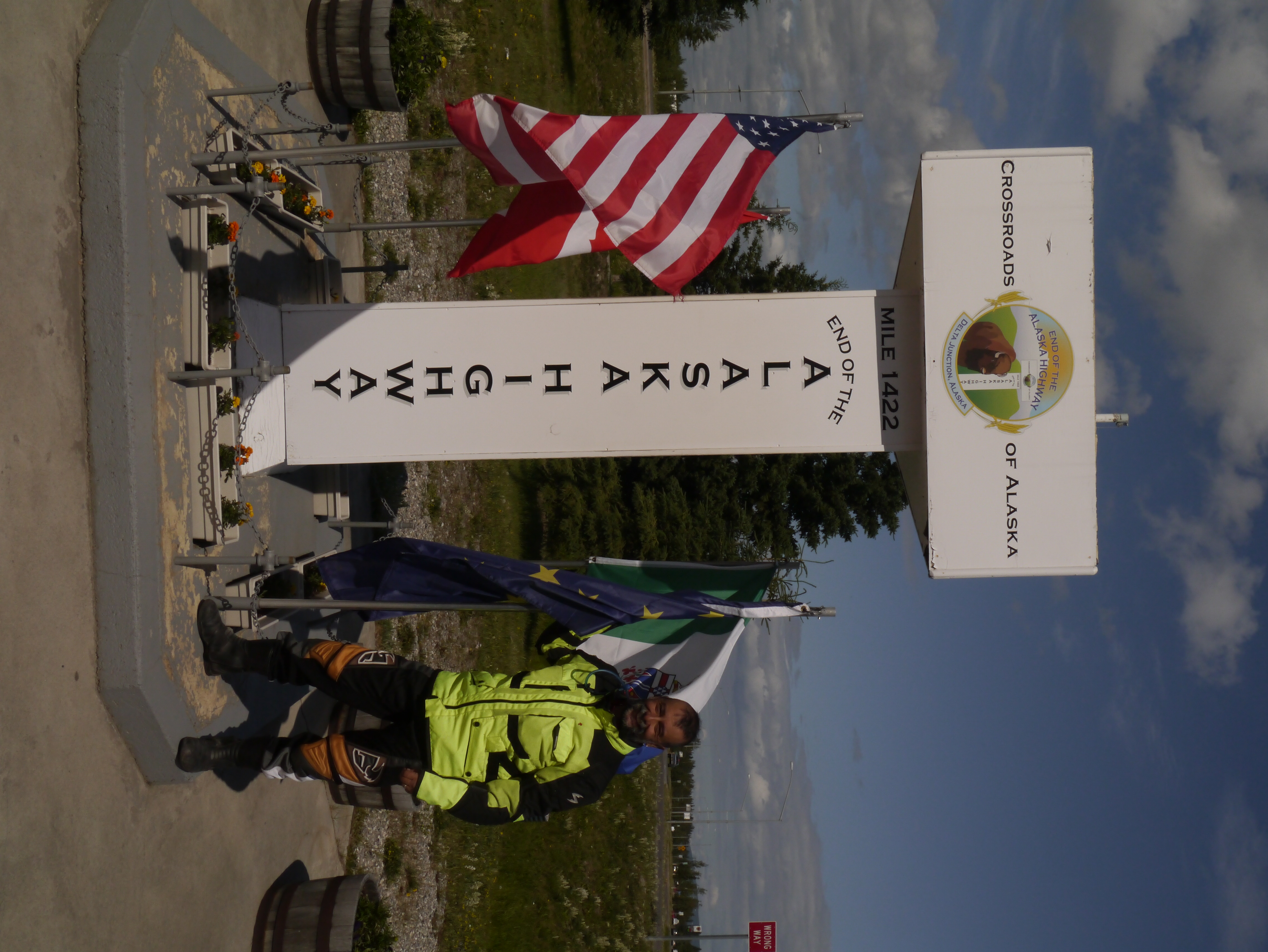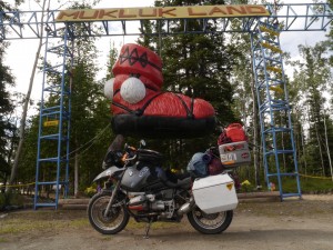 Yesterday morning I got up in Tok, and got ready for a relatively easy ride into Fairbanks, via Delta Junction, where the official end-start point of the Alaska-Canada highway, on the Alaska side is. Outside my tent, mosquitoes that Texas would envy were looming. It is always maddening how it takes to camp a tent site. Yesterday was no different. Took me about one and a half hours to get it all done. Darn! However, the difference between pitching a tent and getting a room at the same site was $80.00. That is a lot of gas on the BeMWu.