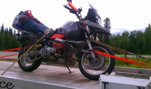 The plan for the day was to be writing this blog entry from Homer, after having reached Anchor Point, the Westernmost point in the continent, reachable by continuous road. The result of today is quite different. I am instead writing from a Motel 6 in Anchorage. Fifty seven miles north of Anchorage, and a few miles north of Wasila, the BeMWu stopped running. I had started noticing earlier that the clutch pull seemed lighter than I am used to. I knew this was not good, so I kept the ride in 5th gear, hoping to ride it as close as possible to Anchorage, where I knew a BMW motorcycle dealership could be found. I was able to keep this up for a few miles, but then, a mandatory stop at a road-work spot forced me to stop. I made the choice at that point to call the ride off, and press the roadside rescue button on my Spot Tracker. I got a call within five minutes, and thanks to the flagger lady, who I will call the Angel in the Bright Yellow Suit, I had the number to the mechanics on hand. This lady made sure I had all the info I needed and kept checking on me until shortly before the tow truck arrived. I helped the truck driver load the bike up on the truck and off we were to Anchorage.